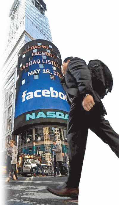 美國紐約納斯達(dá)克證券交易所的電子顯示屏上顯示出“臉譜”在納斯達(dá)克上市的消息。資料圖片