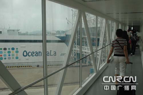旅客正在通過(guò)廊橋登上“海洋拉拉”號(hào)