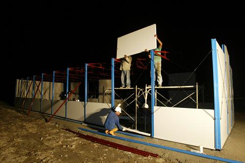 8月20日,大陸援助臺灣臺風(fēng)“莫拉克”災(zāi)區(qū)的首批活動板房已運抵受災(zāi)嚴(yán)重的屏東縣佳冬鄉(xiāng),當(dāng)?shù)毓ぷ魅藛T已開始試裝工作。新華社發(fā)