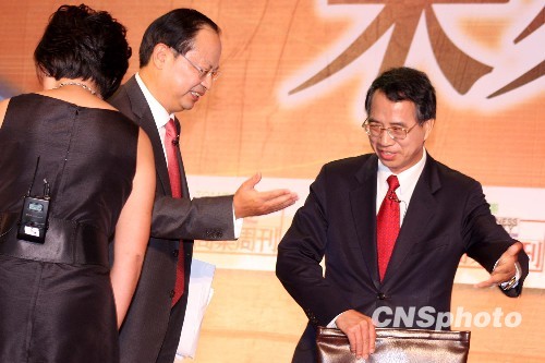 8月24日晚,中國移動董事長王建宙(左)在臺北發(fā)表演講后,與臺灣中華電信董事長呂學錦等人同臺,暢談移動世界的未來影響力。中新社發(fā) 董會峰 攝