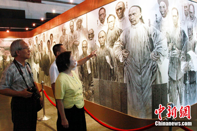 圖為臺灣抗日愛國詩人、教育家丘逢甲的3位遺族在先輩畫像前參觀。中新社發(fā) 黃少華 攝