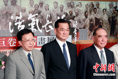 7日,由大陸民間繪制、長逾800米的“浩氣長流·抗戰(zhàn)巨卷史詩畫展”在臺北開幕,以紀(jì)念中國抗日戰(zhàn)爭全面爆發(fā)73周年。中國國民黨榮譽主席連戰(zhàn)(中)、臺灣文化總會會長劉兆玄(左)、曾參與抗戰(zhàn)的前臺灣軍方參謀總長郝伯村(右)出席致辭時都提到,那場為了國家民族尊嚴(yán)與生存而艱苦奮斗的抗戰(zhàn)歷史不應(yīng)忘記。兩岸當(dāng)共同弘揚中華文化,促進和平發(fā)展。中新社發(fā) 黃少華 攝