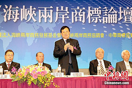 5月10日,國(guó)家工商行政管理總局副局長(zhǎng)付雙建(中)率中華商標(biāo)協(xié)會(huì)代表團(tuán),參加在臺(tái)北舉行的2011海峽兩岸商標(biāo)論壇。付雙建表示,兩岸商標(biāo)保護(hù)與發(fā)展形勢(shì)漸入佳境。中新社發(fā) 路梅 攝