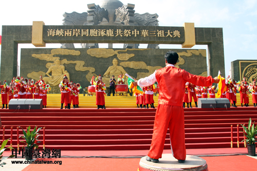 全國(guó)政協(xié)副主席、中央統(tǒng)戰(zhàn)部長(zhǎng)杜青林宣布第四屆海峽兩岸同胞涿鹿共祭中華三祖大典正式開始。在全體肅立中,按祭祀傳統(tǒng)擊鼓鳴鐘之后,海協(xié)會(huì)長(zhǎng)陳云林、中國(guó)國(guó)民黨副主席林豐正等兩岸同胞代表在中華三祖像前敬獻(xiàn)花籃、上香祭拜,并敬獻(xiàn)了三牲、五谷、百果等祭品,來(lái)表達(dá)對(duì)三祖崇高敬意,祈求天下太平、六畜興旺、祈福國(guó)泰民安、五谷豐登,也寓意三祖子孫生生不息、血脈相連、代代相傳。