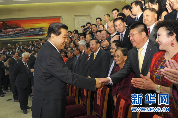 6月19日,中共中央政治局常委、全國(guó)政協(xié)主席、中國(guó)和平統(tǒng)一促進(jìn)會(huì)會(huì)長(zhǎng)賈慶林在北京會(huì)見(jiàn)出席中國(guó)和平統(tǒng)一促進(jìn)會(huì)八屆二次理事大會(huì)的全體代表。新華社記者 饒愛(ài)民 攝