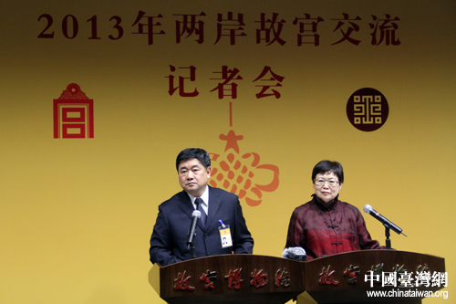 兩岸故宮博物院院長(zhǎng)22日在北京故宮探討合作,在隨后舉行的2013年兩岸故宮交流記者會(huì)上,北京故宮博物院院長(zhǎng)單霽翔與臺(tái)北故宮博物院院長(zhǎng)馮明珠聯(lián)袂出席,回答記者提問(wèn)。(中國(guó)臺(tái)灣網(wǎng) 楊麗 攝)