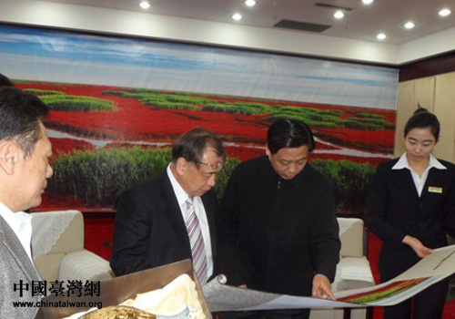 盤錦市市長(zhǎng)贈(zèng)送臺(tái)商具有盤錦地域特色的“天下奇觀紅海灘”蘇繡畫軸留念。(圖片來(lái)源:盤錦市臺(tái)辦)