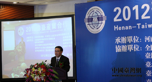 2012豫臺產業(yè)合作交流懇談會于3月23日下午在鄭州隆重舉行,圖為河南省人民政府副省長徐濟超在發(fā)表致辭(中國臺灣網記者 王文英 攝)