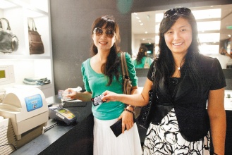 銀聯(lián)卡在臺(tái)灣開通三個(gè)多月,到上周為止,銀聯(lián)卡累積刷卡金額已突破7億多元、筆數(shù)7萬(wàn)多筆,平均每筆消費(fèi)金額新臺(tái)幣1萬(wàn)多元。圖為大陸游客出示銀聯(lián)卡。臺(tái)灣聯(lián)合報(bào)系資料圖