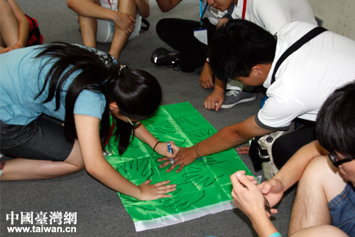 “2013年海峽兩岸紅十字青少年夏令營(yíng)”營(yíng)員們按大陸、臺(tái)灣學(xué)生各一半分成四個(gè)小組,分別取名為“鳳梨鴨”、“V2隊(duì)”、“心海連”和“心綠隊(duì)”!靶木G隊(duì)”營(yíng)員們繪制隊(duì)旗。(中國(guó)臺(tái)灣網(wǎng) 郜利敏 攝)