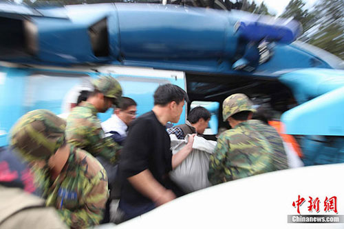 4月27日,臺(tái)灣阿里山景區(qū)發(fā)生小火車翻車事故,現(xiàn)場(chǎng)被當(dāng)?shù)鼐椒怄i。下午5點(diǎn),最后兩個(gè)大陸游客遇難者遺體被抬上直升飛機(jī)。中新社發(fā) 沈存旭 攝