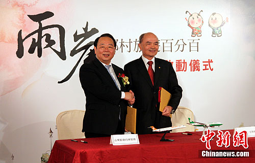 3月26日電,由山東省旅游行業(yè)協(xié)會和臺灣休閑農(nóng)業(yè)發(fā)展協(xié)會聯(lián)合主辦的“兩岸鄉(xiāng)村旅游百分百活動”今天在此間啟動。圖為山東省旅游行業(yè)協(xié)會會長于衝(左一)和臺灣立榮航空公司董事長蘇宏義共同簽署互送客源協(xié)議。 陳立宇 攝