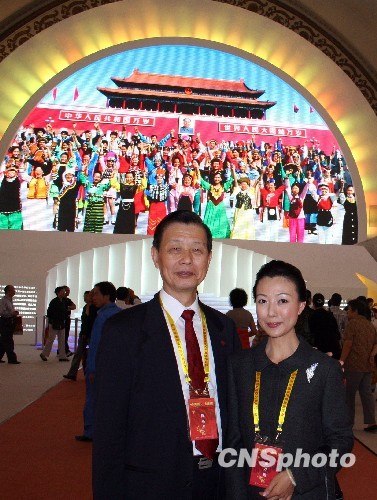 2009年9月29日下午,臺胞國慶觀禮團(tuán)應(yīng)邀來到北京展覽館,參觀館內(nèi)正在舉辦的“輝煌六十年——中華人民共和國成立六十周年成就展”。圖為港澳臺灣同鄉(xiāng)會創(chuàng)會會長陳英杰、廖丹霞夫婦在成就展上合影留念。 中新社發(fā) 孫自法 攝