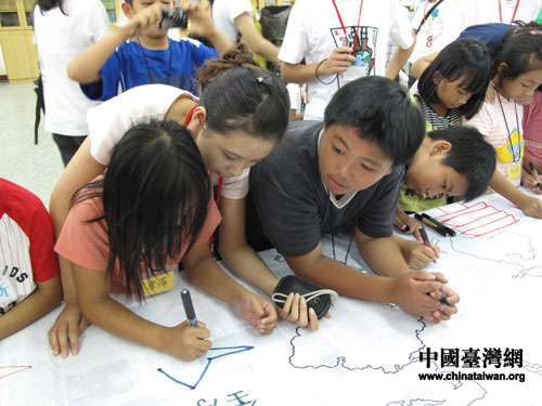 7月22日,廣西大學和臺灣大學學生和臺灣南投縣信義鄉(xiāng)仁和小學學生共畫“心目中的世博場館”。圖片來源:廣西臺辦