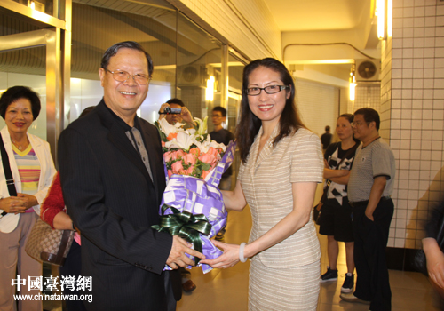 貴陽市臺辦主任李靜(右)熱情歡迎團長廖正豪先生及其一行。(貴陽市臺辦 李慶斌 攝)