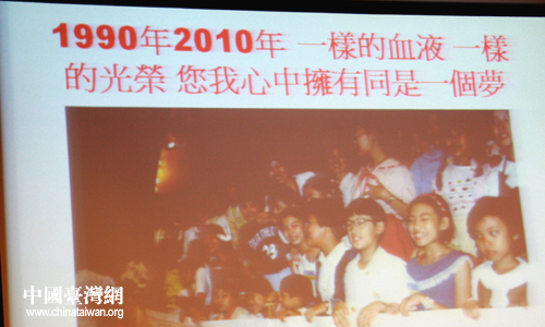 翁林澄還指著一張兩岸小天使們的合影說(shuō)道,你能告訴我他是來(lái)自北京嗎?他是在高雄的下一代嗎?翁林澄說(shuō):“我們兩岸的中國(guó)人都是一樣的臉孔一樣的光榮,我們對(duì)下一代寄予更大的厚望。”