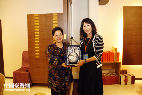 中國青年大陸研究文教基金會董事長李鐘桂博士與中國宋慶齡基金會基金部部長暨本次代表團團長唐九紅女士互贈禮物。 (中國臺灣網(wǎng) 于斯文 攝)
