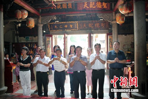 8月4日,臺(tái)灣高雄縣前縣長(zhǎng)楊秋興(前左三)率團(tuán)前往“媽祖故里”福建湄洲島參訪期間,到媽祖祖廟“天后宮”祭拜媽祖。楊秋興稱自己的生日是3月23日,與媽祖同一天出生,到媽祖祖廟拜謁媽祖是他一直的夙愿。楊秋興此次率團(tuán)首次到福建開展“宗教朝圣之旅”,以期用宗教、民俗文化加深兩岸的交流交往。(王華育 攝)