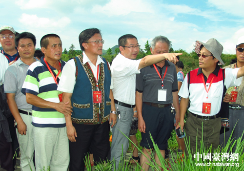 三都縣委副書記羅友軍向臺灣客人介紹水族卯坡。(黔南州臺辦通訊員 張榮周 攝)