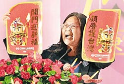 在“2010大陸臺商春節(jié)聯(lián)誼活動”中,“陸委會主委”賴幸媛高舉著“開門迎新福,顧厝護臺灣”的春聯(lián)表示要送給臺商。圖片來源:中國時報