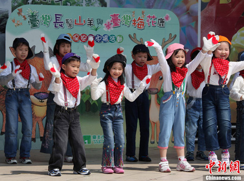 4月7日,臺(tái)北市立動(dòng)物園為臺(tái)灣同胞回贈(zèng)大陸同胞的長(zhǎng)鬃山羊(“喜羊羊”和“樂羊羊”)和梅花鹿(“繁星”和“點(diǎn)點(diǎn)”)舉行祈;顒(dòng),它們即將在16日啟程赴山東劉公島。這場(chǎng)名為“永保安康——為長(zhǎng)鬃山羊與梅花鹿祈!钡幕顒(dòng)吸引了近百名幼兒園小朋友和小學(xué)生參加。圖為祈福儀式上,臺(tái)北小朋友跳起自編自演的動(dòng)物舞蹈。路梅 攝