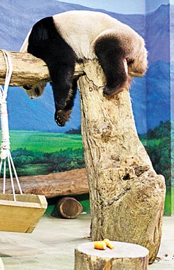 大熊貓“圓圓”雖出現(xiàn)發(fā)情跡象,但15日卻在室內(nèi)倒頭大睡,連午餐都沒吃。(來源:臺灣《中國時報》)