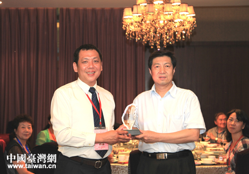 臺(tái)灣中華兩岸婚姻協(xié)調(diào)促進(jìn)會(huì)理事長(zhǎng)鐘錦明(左)向省臺(tái)辦副主任周越明贈(zèng)送紀(jì)念品。(云南省臺(tái)辦 李仁興 攝)