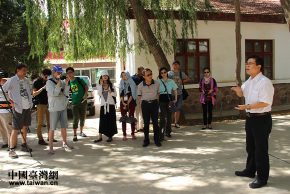 中科院沙坡頭沙漠研究實驗站站長李新榮向兩岸記者團介紹沙坡頭治沙技術(shù)及成果(中國臺灣網(wǎng) 王文英 攝)