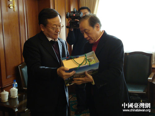 撫順市委副書記喻國偉與臺灣新黨主席郁慕明互贈禮品。圖片來源:撫順臺辦