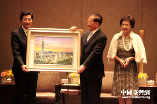 連戰(zhàn)向郭金龍贈送畫有臺北101高樓的油畫(中國臺灣網(wǎng) 趙輝 攝)