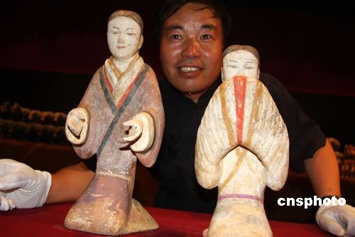 圖為陜西漢陽陵考古陳列館副館長王保平在展示造型精美的跽坐狀侍女俑和拱手女傭。中新社發(fā) 董會峰 攝