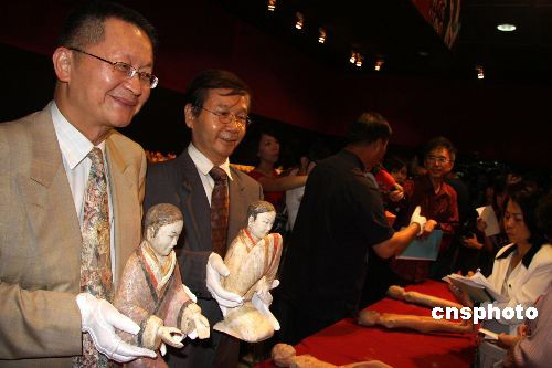 圖為臺灣金傳媒集團(tuán)執(zhí)行長楊仁烽(左一)、臺北歷史博物館館長黃永川(左二)面帶微笑,向記者展示彩繪女陶俑。中新社發(fā) 董會峰 攝