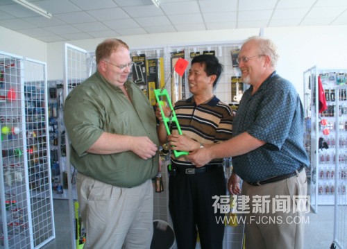 8月3日,美國威斯康新洲2名客商專程來到福建東山的臺資企業(yè)元煌集團參觀新開發(fā)的漁具、釣具樣品,簽下一筆大額訂單。由臺商呂榜洲先生創(chuàng)辦的元煌集團,積極應(yīng)對國際金融危機,今年來開發(fā)歐美新興的冰上釣具、漁具等6個系列產(chǎn)品,暢銷國際市場。(謝漢杰 攝)