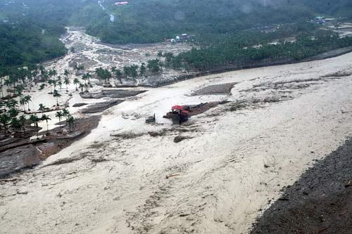 一度傳聞有700人遭活埋的重災(zāi)區(qū)高雄縣甲仙鄉(xiāng)小林村,全村只剩地勢最高的兩間民房,其它房舍全給泥石流埋掉,不見蹤影。(圖片來源:臺灣《聯(lián)合報》)