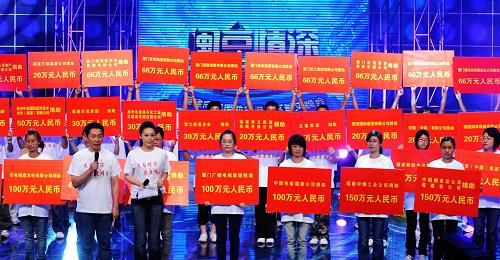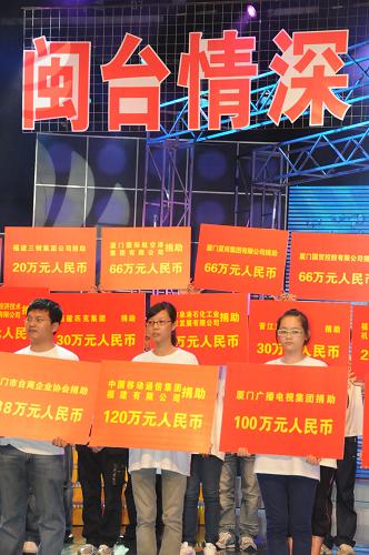 8月19日,社會各界在賑災(zāi)晚會上紛紛捐款獻(xiàn)愛心。當(dāng)日,福建省舉行福建同胞援助臺灣災(zāi)區(qū)賑災(zāi)晚會,幫助在臺風(fēng)“莫拉克”中受災(zāi)的臺灣同胞渡過難關(guān)。福建省紅十字會當(dāng)晚接受社會各界捐助人民幣8681萬多元。新華社記者 張國俊 攝