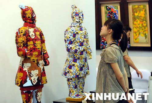 8月27日在臺北國際藝術(shù)博覽會現(xiàn)場拍攝的大陸藝術(shù)家劉楓華、劉勇創(chuàng)作的雕塑作品《新兵馬俑》。2009臺北國際藝術(shù)博覽會8月28日在臺北開展,吸引了來自中國大陸和日本、韓國、芬蘭、波蘭、意大利等地的藝術(shù)家前來參展。據(jù)了解,本次博覽會的門票收益以及藝術(shù)家捐贈作品的義賣收入將全部捐獻給臺灣災(zāi)區(qū)。新華社發(fā)(吳景騰 攝)