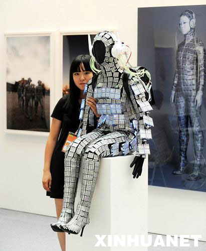 8月27日,在臺北國際藝術(shù)博覽會現(xiàn)場,日本行為藝術(shù)家山口典子展示她用1200片手機鍵盤制作的《手機女孩》。2009臺北國際藝術(shù)博覽會8月28日在臺北開展,吸引了來自中國大陸和日本、韓國、芬蘭、波蘭、意大利等地的藝術(shù)家前來參展。據(jù)了解,本次博覽會的門票收益以及藝術(shù)家捐贈作品的義賣收入將全部捐獻給臺灣災(zāi)區(qū)。新華社發(fā)(吳景騰 攝)
