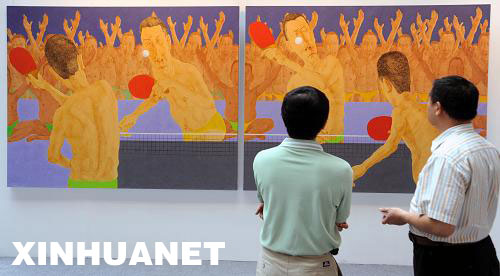 8月27日在臺北國際藝術(shù)博覽會現(xiàn)場拍攝的大陸畫家鐘山的作品《乒乒乓乓》。2009臺北國際藝術(shù)博覽會8月28日在臺北開展,吸引了來自中國大陸和日本、韓國、芬蘭、波蘭、意大利等地的藝術(shù)家前來參展。據(jù)了解,本次博覽會的門票收益以及藝術(shù)家捐贈作品的義賣收入將全部捐獻給臺灣災(zāi)區(qū)。新華社發(fā)(吳景騰 攝)