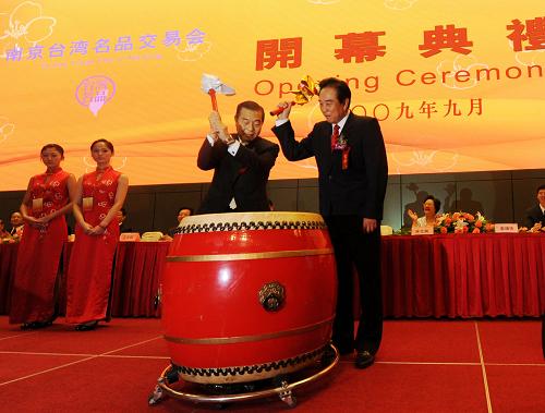 9月17日,海協(xié)會會長陳云林(前右)與臺北世貿(mào)中心董事長王志剛(前左)共同擂鼓為交易會揭幕。當日,由南京市政府與臺北世貿(mào)中心聯(lián)合舉辦的“2009南京臺灣名品交易會”在南京國際博覽中心開幕。展會參展企業(yè)達到750家,其中臺灣本土企業(yè)占73%,大陸臺企占27%,是歷年來臺商企業(yè)產(chǎn)品在大陸最大規(guī)模的集中亮相。 新華社記者 姜帆 攝