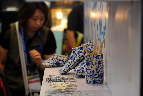 9月17日,一位買家在交易會上觀看臺商的“青花瓷”系列創(chuàng)意產(chǎn)品。新華社記者 姜帆 攝