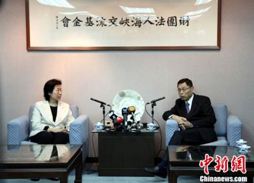 10月27日,大陸海協(xié)會(huì)副秘書長張勝林等抵達(dá)臺(tái)灣,了解在臺(tái)灣蘇花公路失蹤的20名大陸同胞的搜救進(jìn)展情況。圖為張勝林(左)下午會(huì)見海基會(huì)副董事長高孔廉。中新社記者 陳立宇 攝