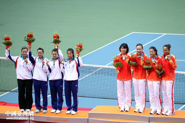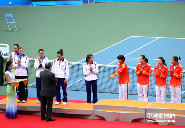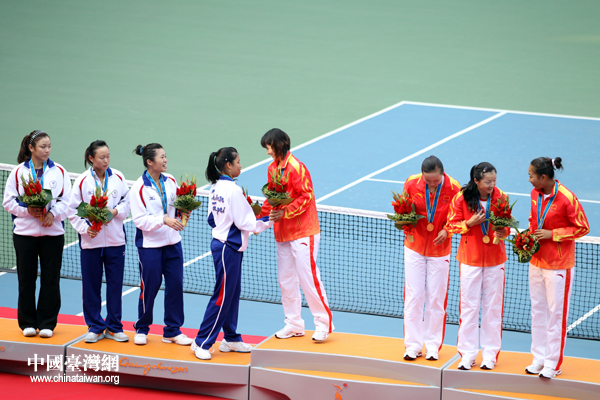 中國(guó)臺(tái)灣網(wǎng)11月16日廣州消息 第十六屆廣州亞運(yùn)會(huì)女子網(wǎng)球團(tuán)體賽決賽,雖然中華臺(tái)北隊(duì)不敵中國(guó)隊(duì),獲得銀牌,但在頒獎(jiǎng)儀式上,兩岸女網(wǎng)金花們卻十分輕松,交流不斷。(記者 鐘寶華)