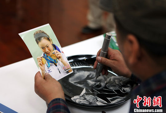 12月4日,吉林瓷刻藝術(shù)家劉世杰在臺(tái)中市展覽現(xiàn)場(chǎng),以在廣州亞運(yùn)上奪得2塊金牌的中華臺(tái)北運(yùn)動(dòng)員詹詠然為題材,創(chuàng)作瓷盤雕刻!2010吉林市文化藝術(shù)展覽”在臺(tái)中市開幕,吉林市多位著名藝術(shù)家的書法、水墨、篆刻、剪紙逾200幅作品參展。展覽以關(guān)東風(fēng)情、冰雪文化為主題,將持續(xù)至明年1月23日,為臺(tái)中市民帶來跨年度的藝術(shù)盛宴。