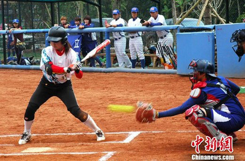 4月2日下午,“2011楠景新城杯·海峽兩岸女子壘球賽”在云南西雙版納楠景新城棒壘球訓(xùn)練基地舉行。圖為臺北體育學(xué)院隊與廣東女壘進(jìn)行比賽。 中新社發(fā) 楊穎融 攝