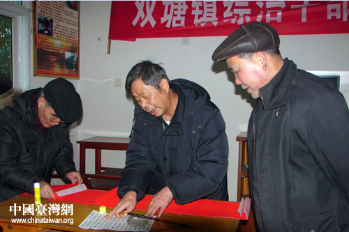 中國臺灣網(wǎng)2月2日吉首消息 日前,湘西州吉首市重點臺屬、市詩詞楹聯(lián)協(xié)會副會長陳金章,組織10余名會員和部分臺屬冒著嚴寒來到該市雙塘鎮(zhèn),開展送春聯(lián)進農(nóng)家活動;顒蝇F(xiàn)場氣氛熱烈,會員們興致勃勃揮毫潑墨,寫下了對偉大祖國的贊美,對美好生活的向往,對新年的祝福。短短兩個多小時,會員們?yōu)榇迕駮鴮懴铝私?00幅春聯(lián)。紅彤彤的春聯(lián),傳遞著春的氣息,給村民們帶了歡樂和吉祥。(中國臺灣網(wǎng)吉首市臺辦通訊員 張明能)