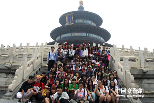 臺灣南部旅游院系學生交流參訪團與大陸學生在天壇祈年殿前合影留念。(中國臺灣網(wǎng) 王曉蕊 攝)
