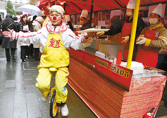 2月28日,一場融合了美食、民俗表演于一體的臺灣風情美食節(jié)在永安休閑街向市民和游客開放。圖為一名小丑為游客表演獨輪車送餐。 本報記者 張海峰 通訊員 蔡維帥 攝