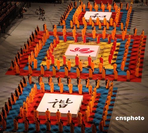 最后,數(shù)百位法師分別圍坐于和、諧二字及蓮花標(biāo)識(shí)四周,雙手合什,在片片飄落的菩提葉中,與現(xiàn)場(chǎng)數(shù)萬(wàn)信眾齊頌《吉祥偈》、《文殊心咒》、《啟告十方》等經(jīng)文。待點(diǎn)點(diǎn)燈光燃起,“福我世界、國(guó)富太平、社會(huì)安和、人民樂(lè)利……”的傳頌聲遠(yuǎn)播四方,“和諧世界、眾緣和合”的主題亦跨越兩岸、遍傳世界。