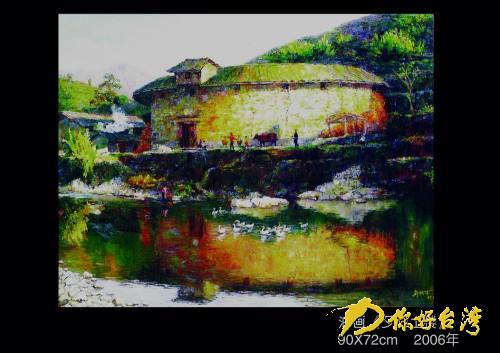 不論油畫還是漆畫,土樓是周榕清創(chuàng)作的一大題材。土樓夕照、土樓晨曦、土樓遺韻,土樓里或悠閑或忙碌的人們以及土樓的春、秋、夏、冬……。漆畫和油畫這兩種原本完全不相融通的中外繪畫語言在他的畫筆里得到有機(jī)、和諧的融合,淋漓盡致地表現(xiàn)著土樓的神秘、美麗、純樸和愚智。