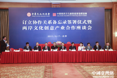 中國臺灣網(wǎng)9月7日北京消息 今日,中華文化促進會(以下簡稱“文促會”)與來自臺灣的中華兩岸文化創(chuàng)意發(fā)展協(xié)會(以下簡稱“文創(chuàng)會”)在京舉行了訂立協(xié)作關(guān)系備忘錄簽署儀式,并就兩岸文化創(chuàng)意產(chǎn)業(yè)合作展開座談。